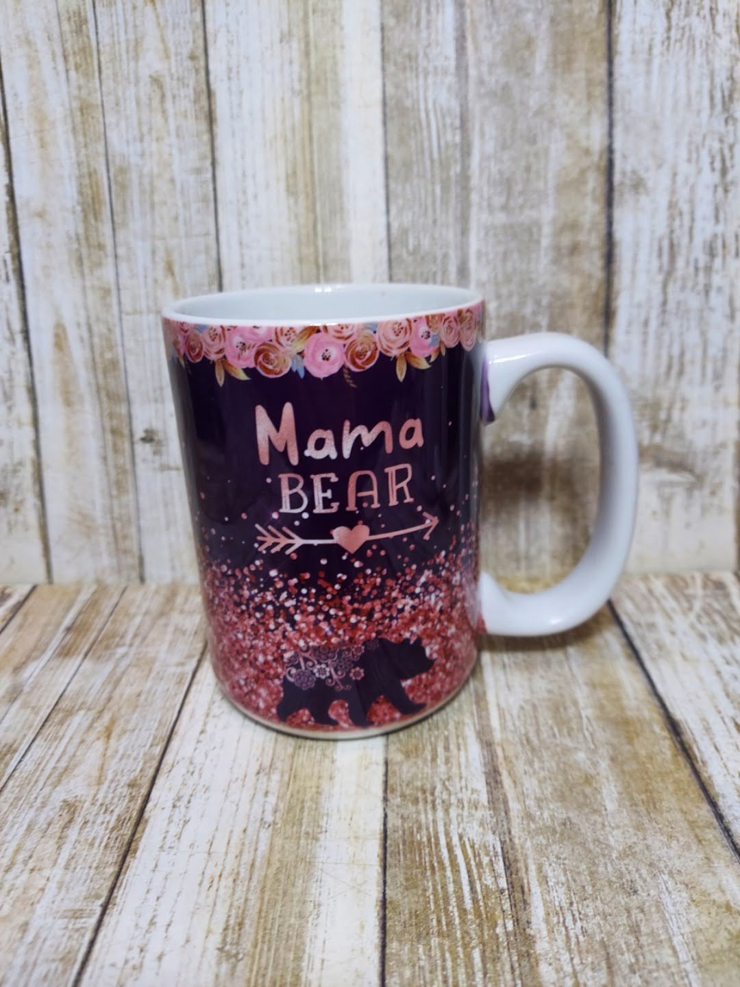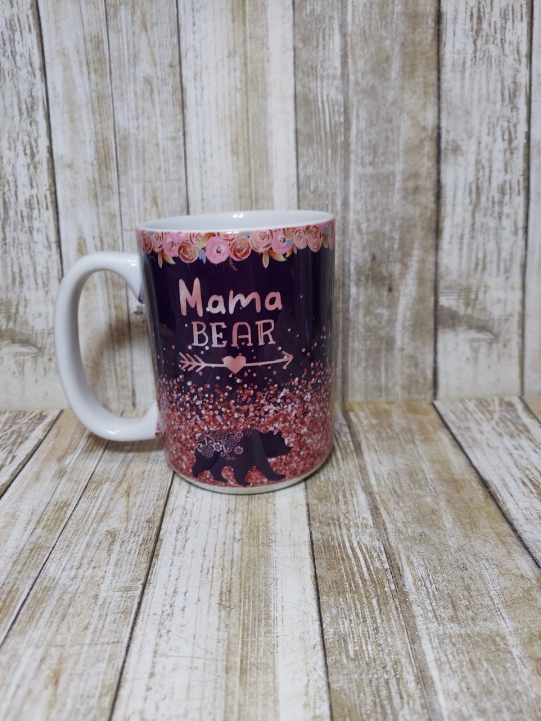 • Color/Design: Pink floral top border, glitter-style pattern, “Mama Bear” text with arrow and heart