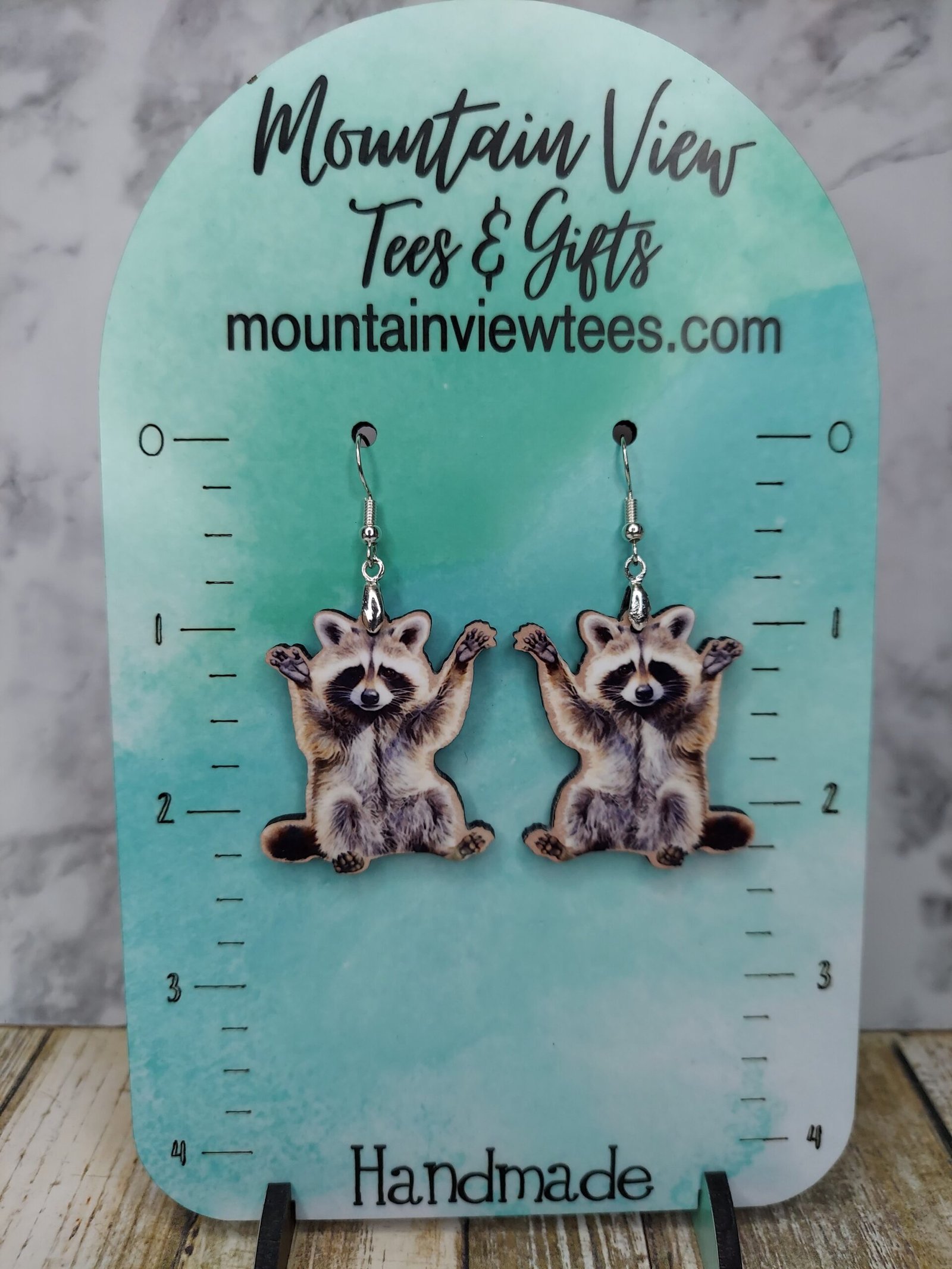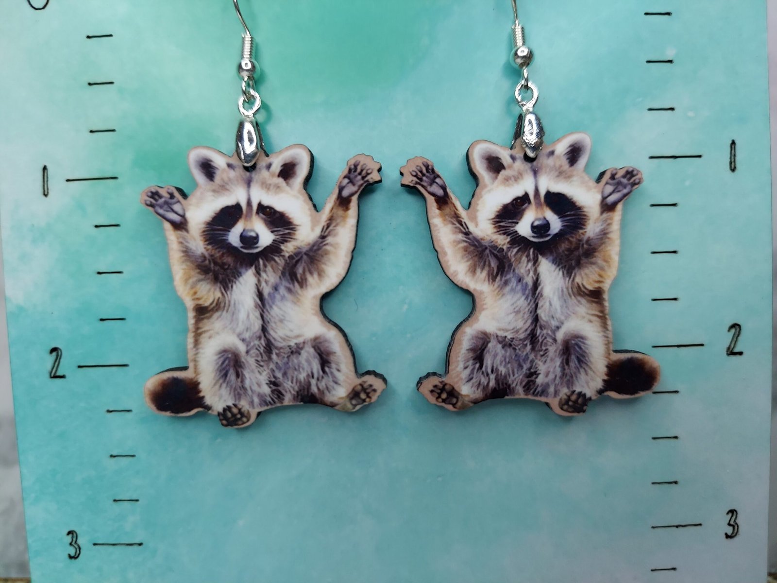 Each earring features a detailed raccoon with its arms raised, giving the design a fun, expressive look that feels both whimsical and full of character. The artwork is crisp and vibrant, printed on durable MDF that keeps the earrings feather-light while still offering a smooth, glossy finish. You get all the visual impact without any of the heaviness that can make earrings uncomfortable over time. These are designed for all-day wear — whether you’re running errands, heading to work, or spending the day at a festival or craft fair.