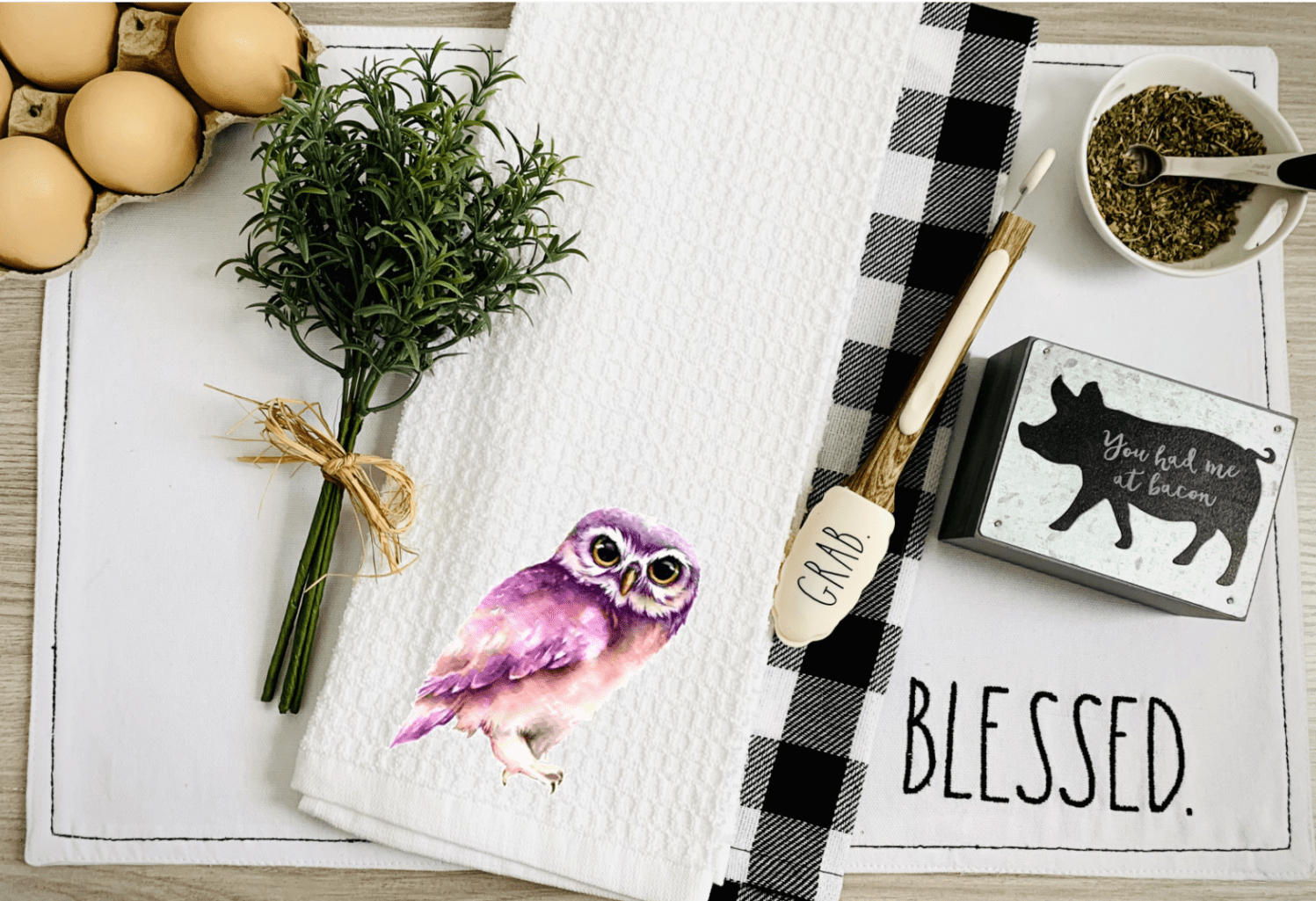 Waffle Weave owl kitchen towel measures 16″x24″. Super absorbent for even the toughest messes and the perfect addition to your kitchen.