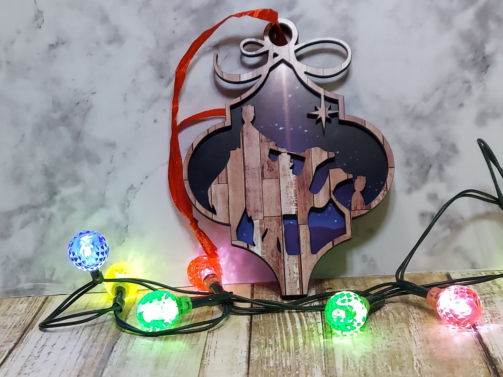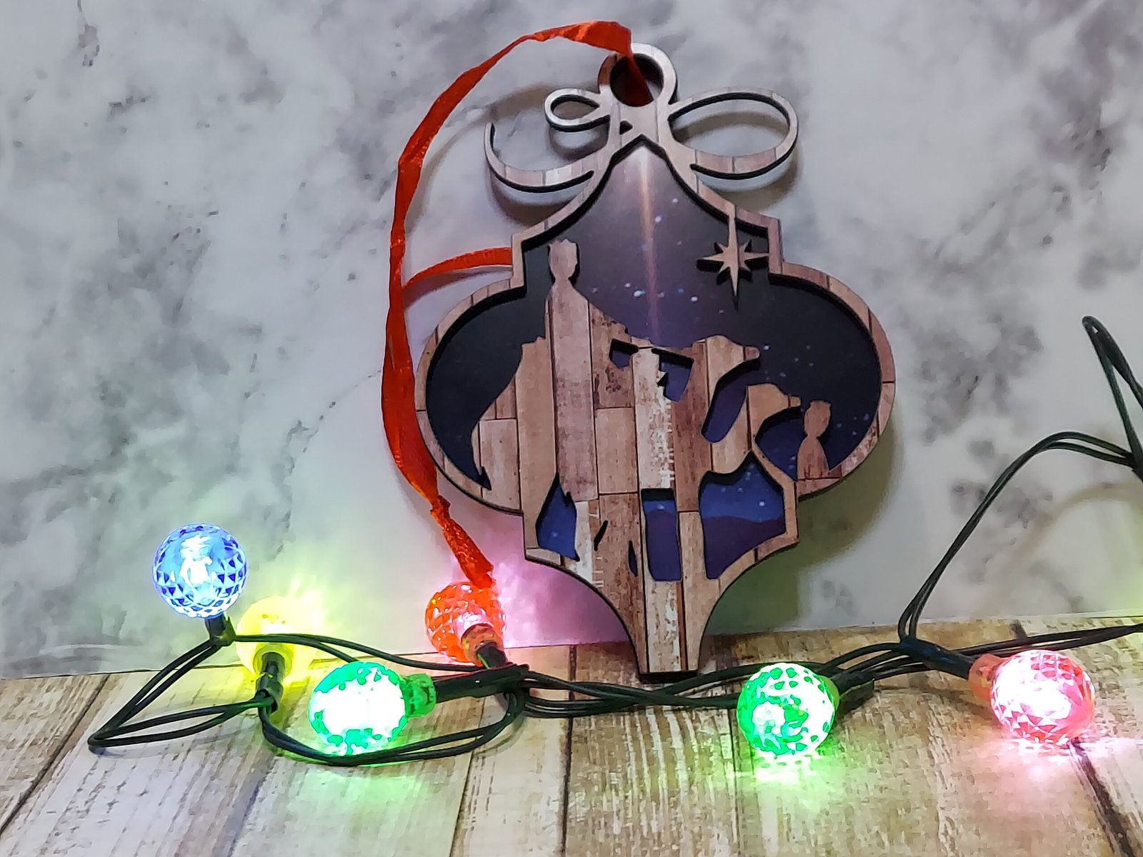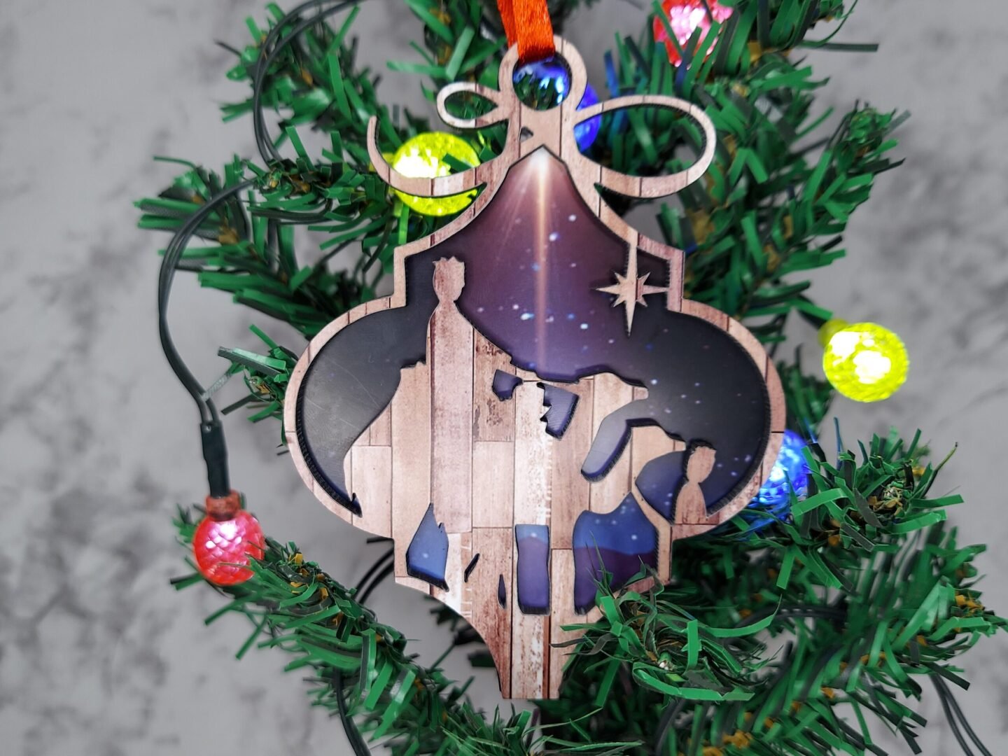 Layered Christmas Wise Men Ornament featuring a nativity scene as Wise Men travel on a camel following the Northern Star toward Bethlehem.